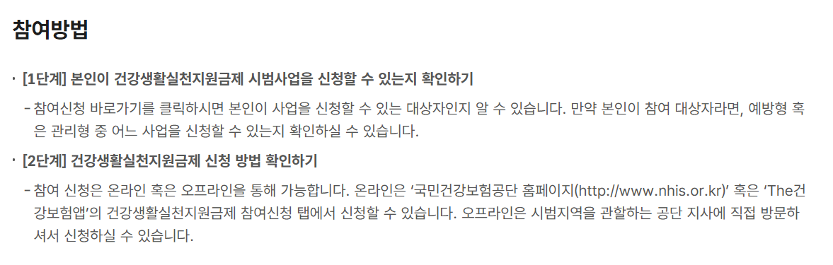- The건강보험 앱 또는 국민건강보험공단 건강iN 웹사이트 접속 → ‘건강생활실천지원금제’ 메뉴에서 신청
