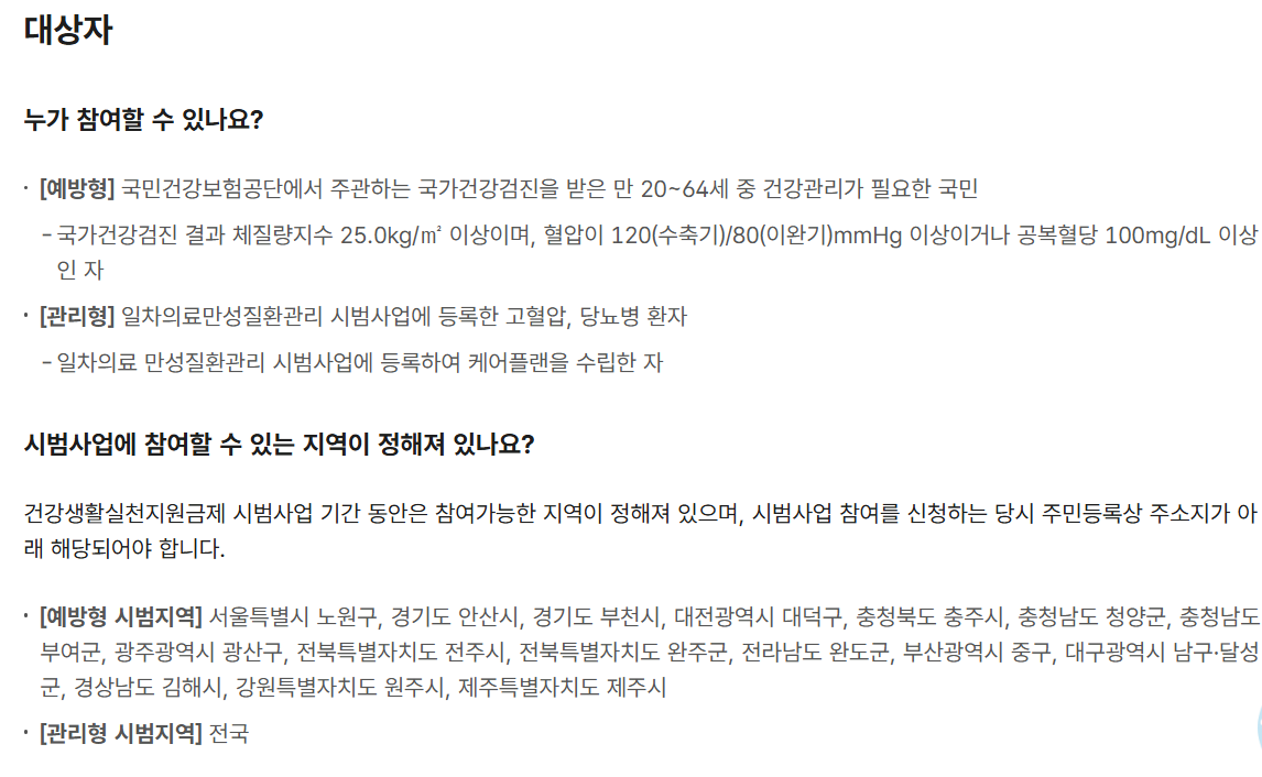 | 예방형 | 최근 6개월 내 건강검진, BMI ≥25 kg/㎡ + 혈압 또는 공복혈당 이상 | 2년간 |